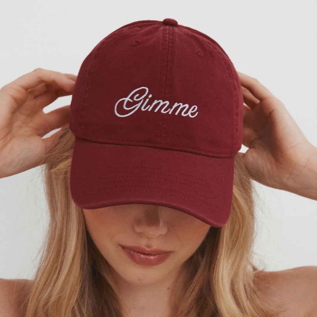 This classic soft dad cap is a gorgeous cherry red with 'Gimme' embroidered in light blue.