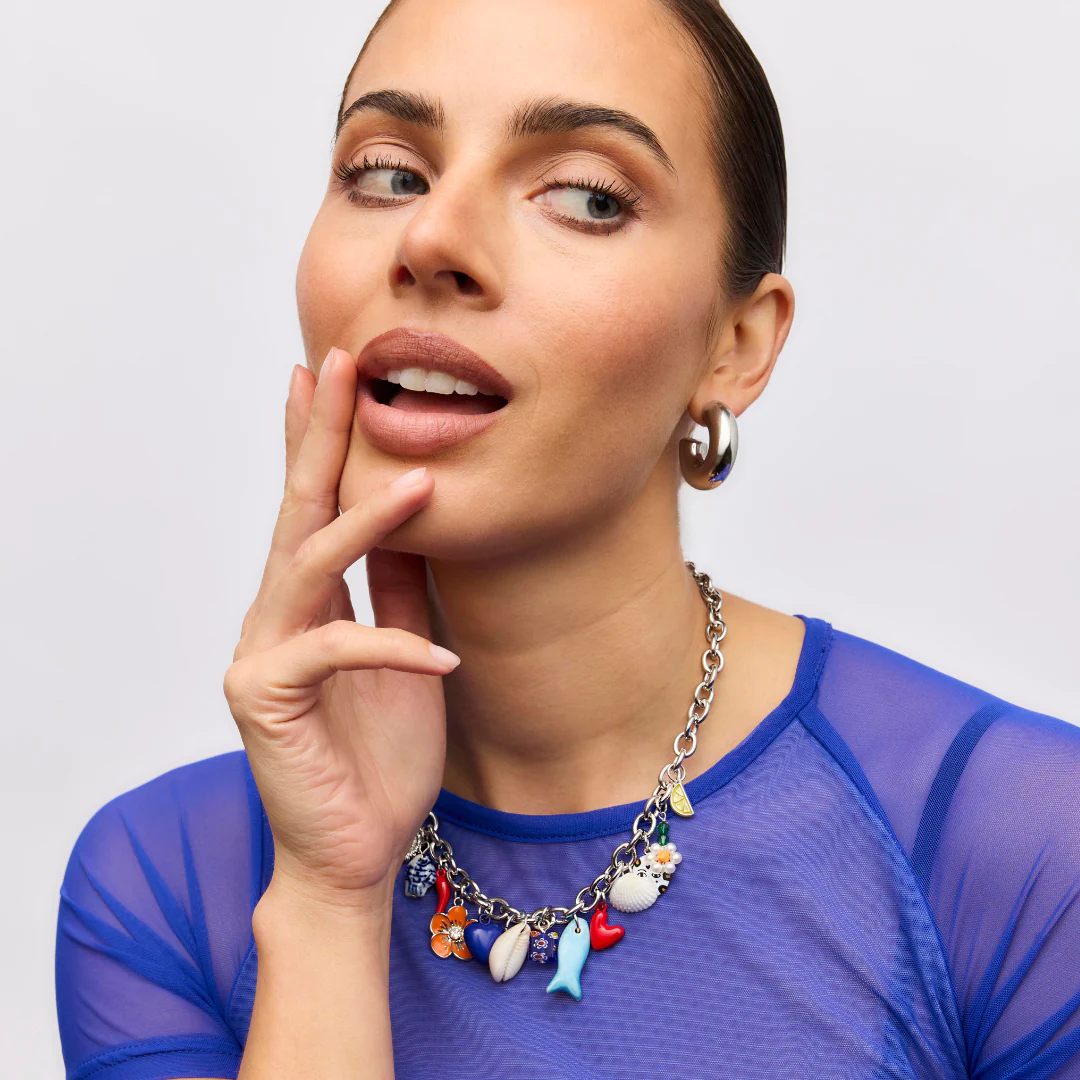 The Positano Necklace is a cool, statement-making piece featuring a chunky stainless steel chain with colourful charms. Inspired by the bright, bold colours of the Amalfi coast, it's made to bring a little sunshine to your everyday look (holiday or not).